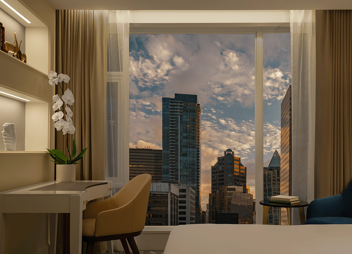 Located in the pulse of Vancouver’s thriving downtown core, our hotel is just steps away from the bustling Financial and Fashion districts, surrounded by world-class dining options, and minutes away from Vancouver’s vibrant waterfront. Guests can enjoy the convenience of having Holt Renfrew and other luxury shops nearby, along with a scenic waterfront walk to Stanley Park and the lively atmosphere of Robson Street, featuring restaurants and theatres.