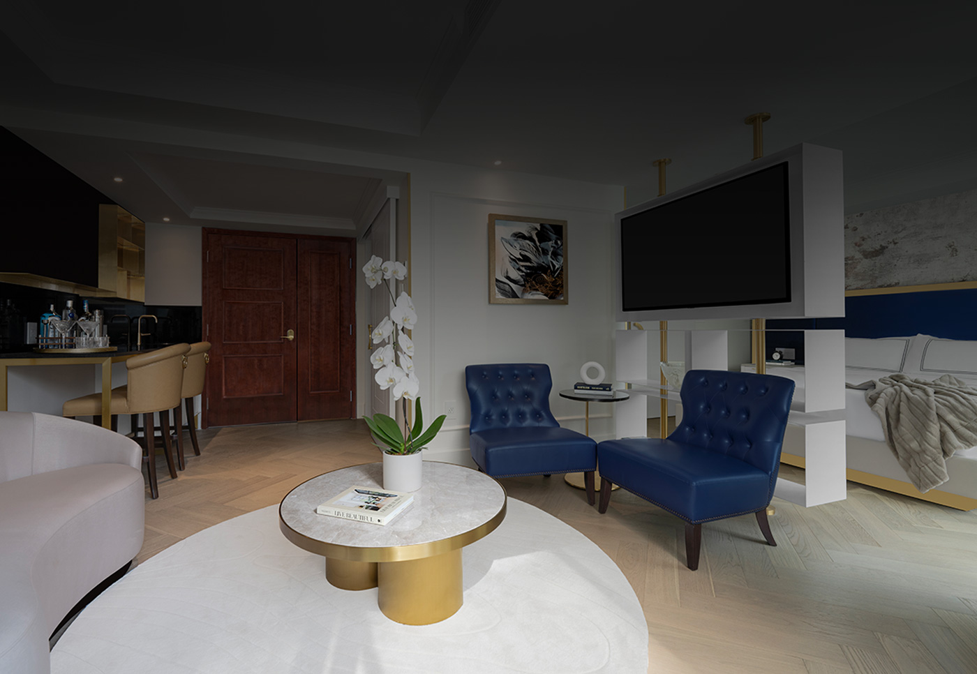 Discover unparalleled luxury at the AZUR Legacy Collection Hotel, where our rooms and suites are thoughtfully designed for the discerning traveler. Our spacious and stylish accommodations effortlessly combine grandeur with a hint of 1940s Art-Deco charm, ensuring a lavish and cozy stay. The interiors boast sophistication, showcasing elegant touches like marble bathrooms, gas fireplaces, and intricate brass accents. Each room is adorned with custom furniture, captivating artworks, and beautiful high-gloss wood doors, creating an atmosphere of absolute opulence.